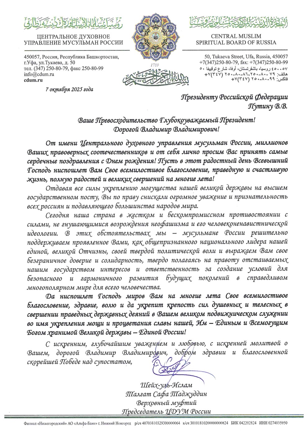 Поздравление Верховного муфтия Президенту РФ В.В.Путину по случаю Дня рождения