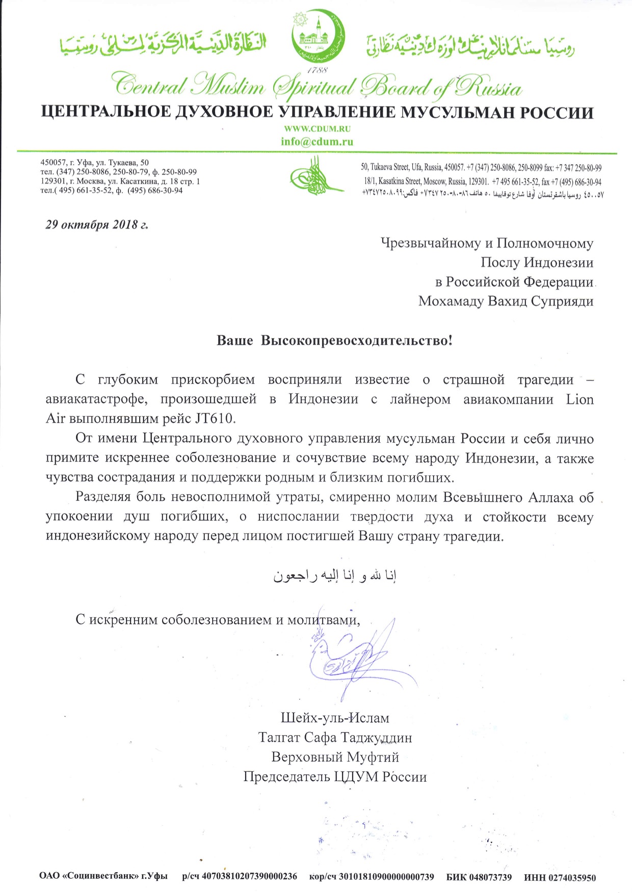 Верховный муфтий выразил соболезнования Чрезвычайному и Полномочному Послу Индонезии в РФ в связи с авиакатастрофой |