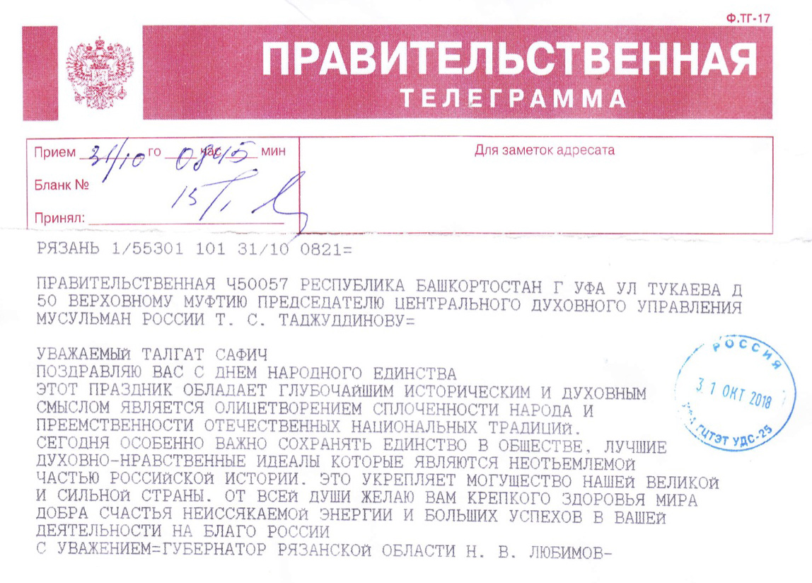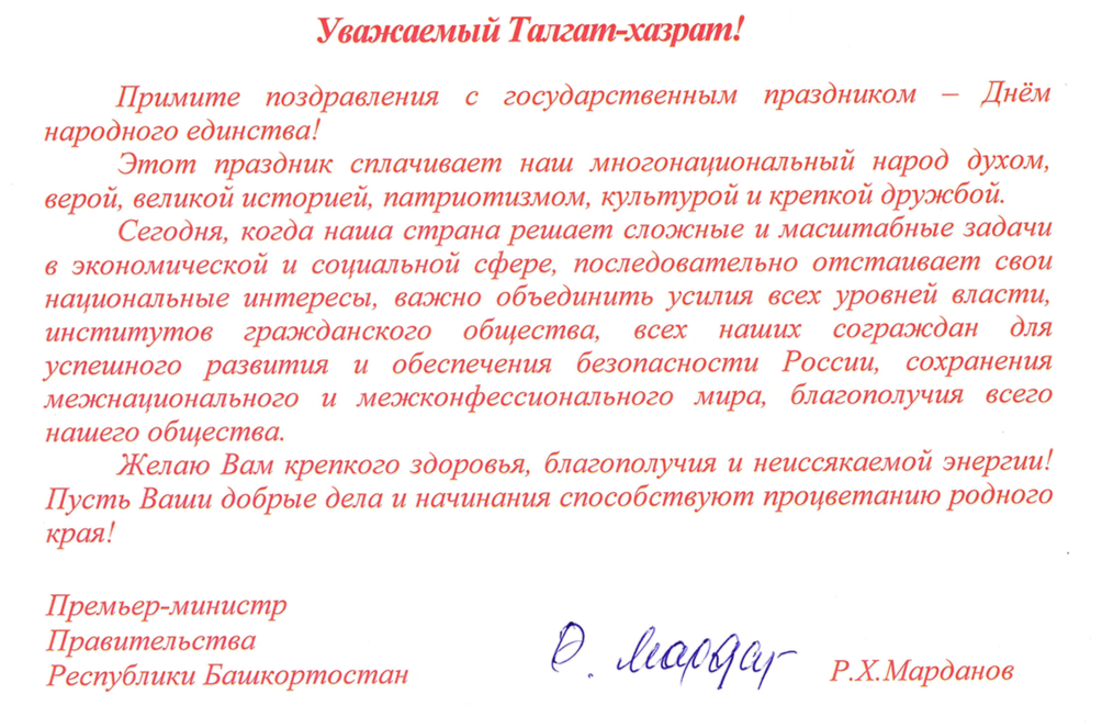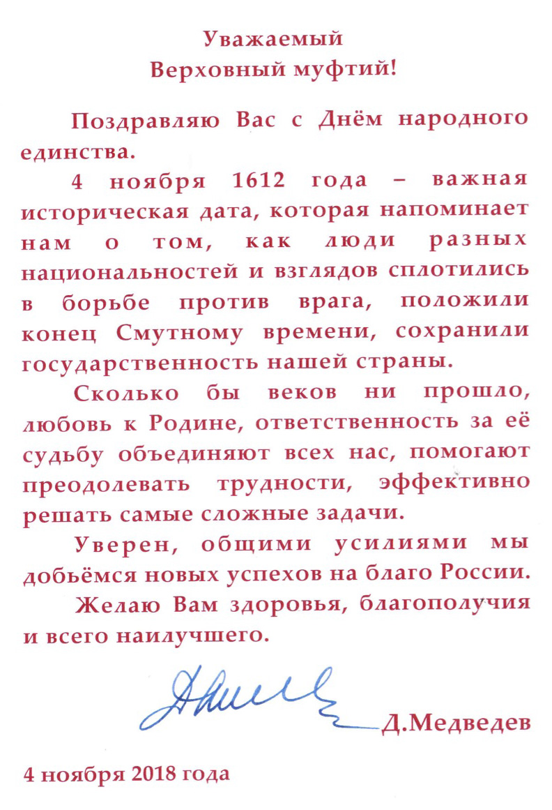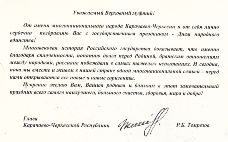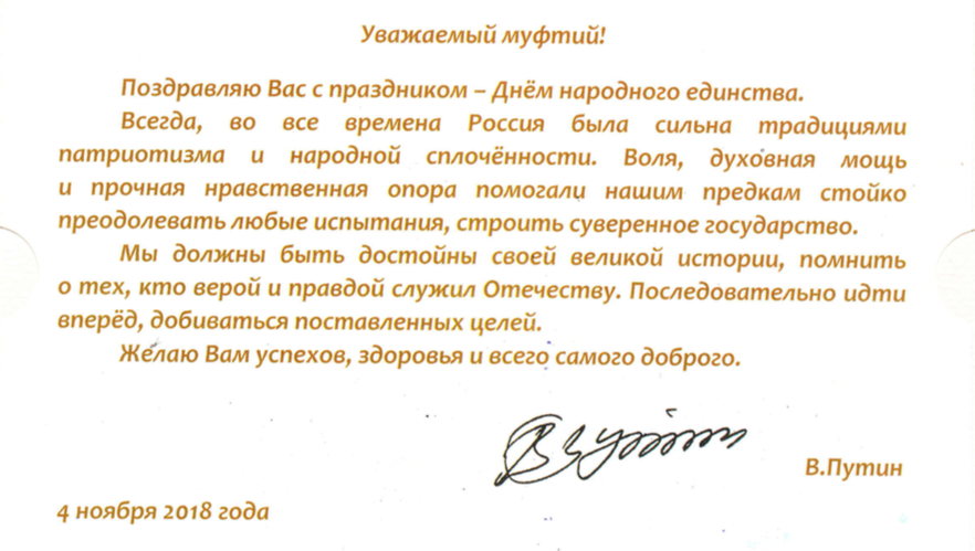 Поздравления Верховному муфтию по случаю Дня народного единства