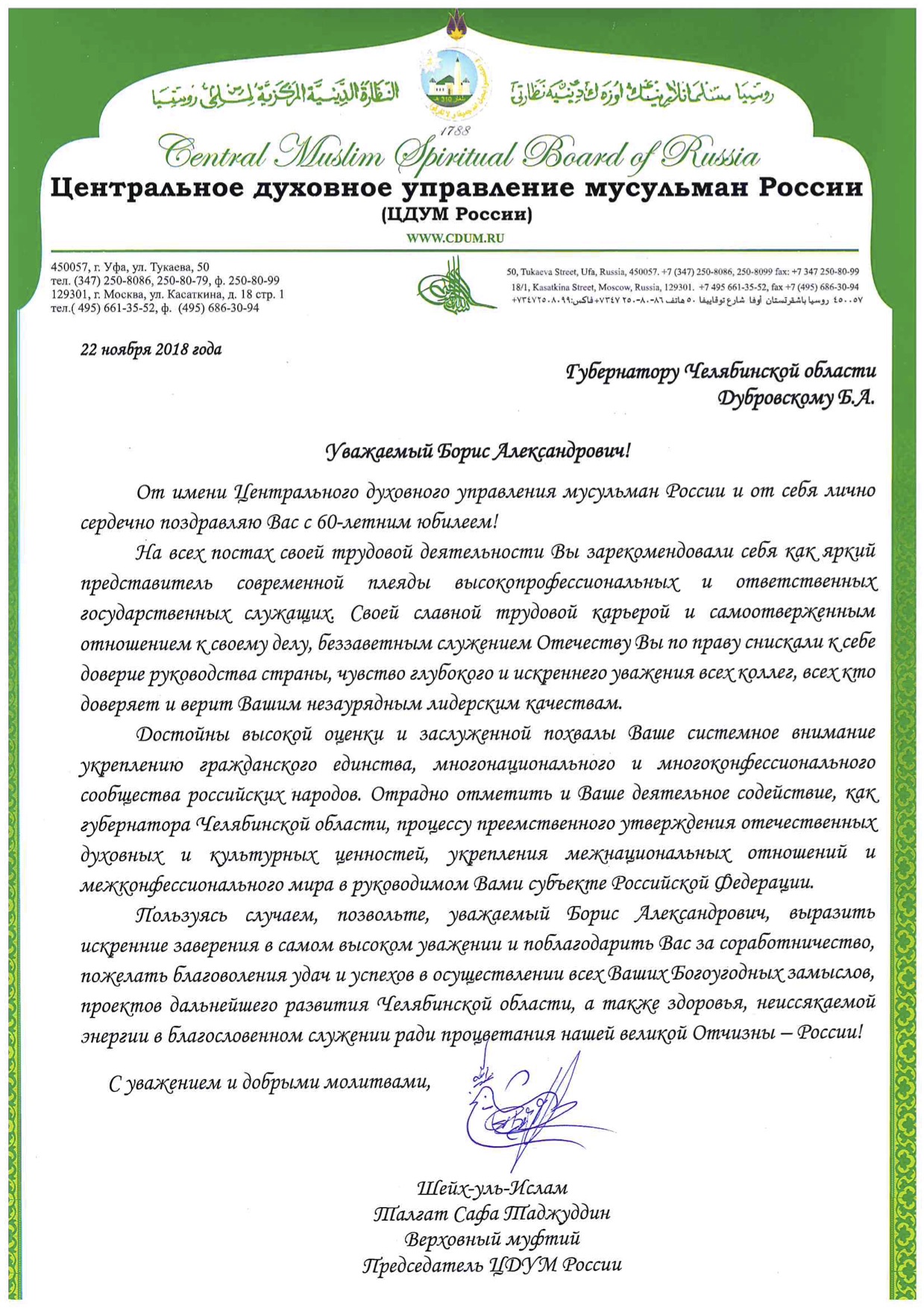 Поздравление Верховного муфтия губернатору Челябинской области Б.А.Дубровскому с юбилеем