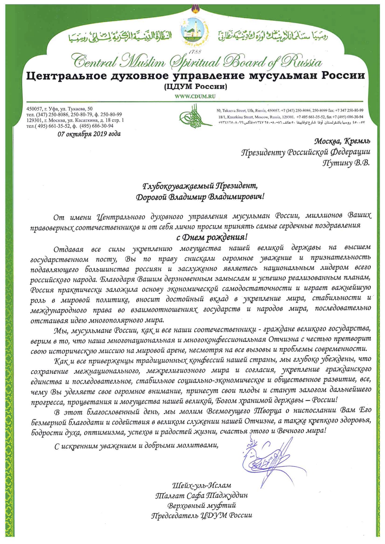 Поздравление Верховного муфтия Президенту РФ В.В.Путину по случаю Дня рождения
