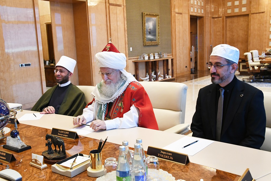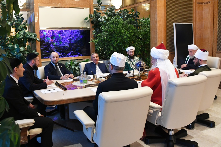 В Доме Правительства Республики Татарстан состоялась встреча Раиса РТ Рустама Минниханова с Шейх-уль-Исламом, Верховным муфтием, Председателем ЦДУМ России Талгатом Сафа Таджуддином. В беседе также приняли участие: председатель ДУМ РТ, муфтий Камиль Самигуллин; профессор БИА, РИУ ЦДУМ России, Амманского международного университета исламских наук (Иордания), прямой потомок Пророка Мухаммада (с.а.с.), шейх Абдурраззак Ассаиди; Министр вакуфов Арабской Республики Египет Усама Аль-Азхари; ректор РИУ ЦДУМ России Гумар Таджуддинов; руководитель Администрации Раиса РТ Асгат Сафаров и другие официальные лица. Рустам Минниханов тепло приветствовал гостей и вручил Талгату Сафа Таджуддину государственную награду – медаль ордена «За заслуги перед Республикой Татарстан», отметив особый вклад Верховного муфтия в сохранение духовно-нравственных традиций, укрепление межнационального и межконфессионального мира и согласия. Особо Раис РТ подчеркнул роль Шейх-уль-Ислама в возрождении древней столицы Волжской Булгарии и в развитии Болгарского государственного историко-архитектурного музея-заповедника.
