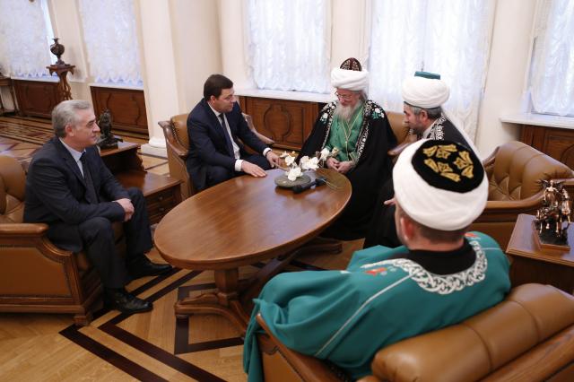 На встрече Верховный муфтий представил губернатору нового председателя РДУМ Свердловской области ЦДУМ России – Радифуллу-хазрата Гиндуллина.