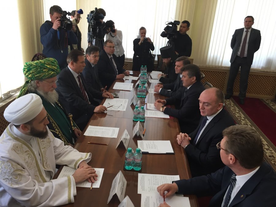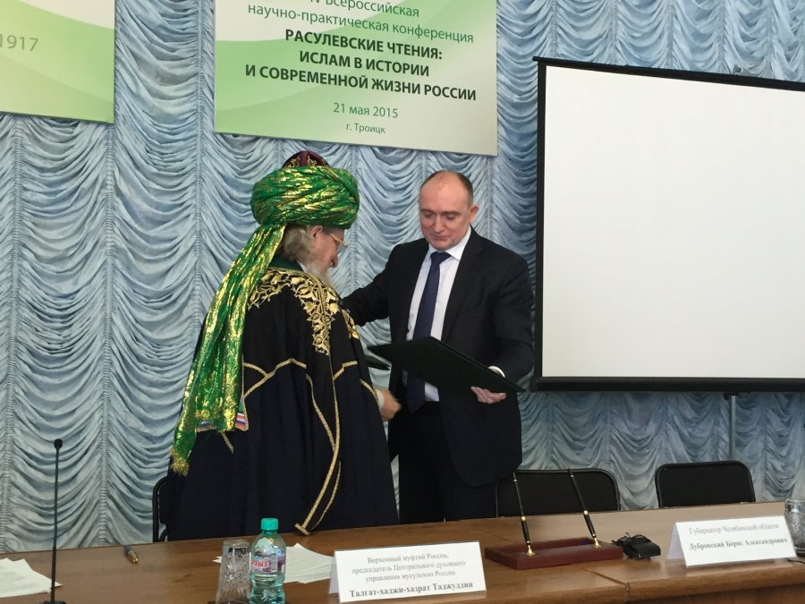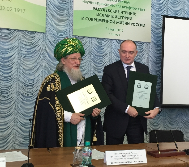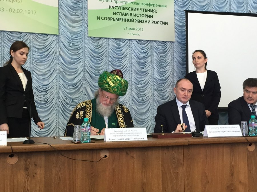 Шейх-уль-Ислам Талгат Сафа Таджуддин и губернатор региона Борис Дубровский скрепили подписями документ о социальном партнерстве, который заключен в рамках научно-практической конференции «Расулевские чтения: Ислам в истории и современной жизни России», проходящей в Троицке, и является одним из центральных событий форума.