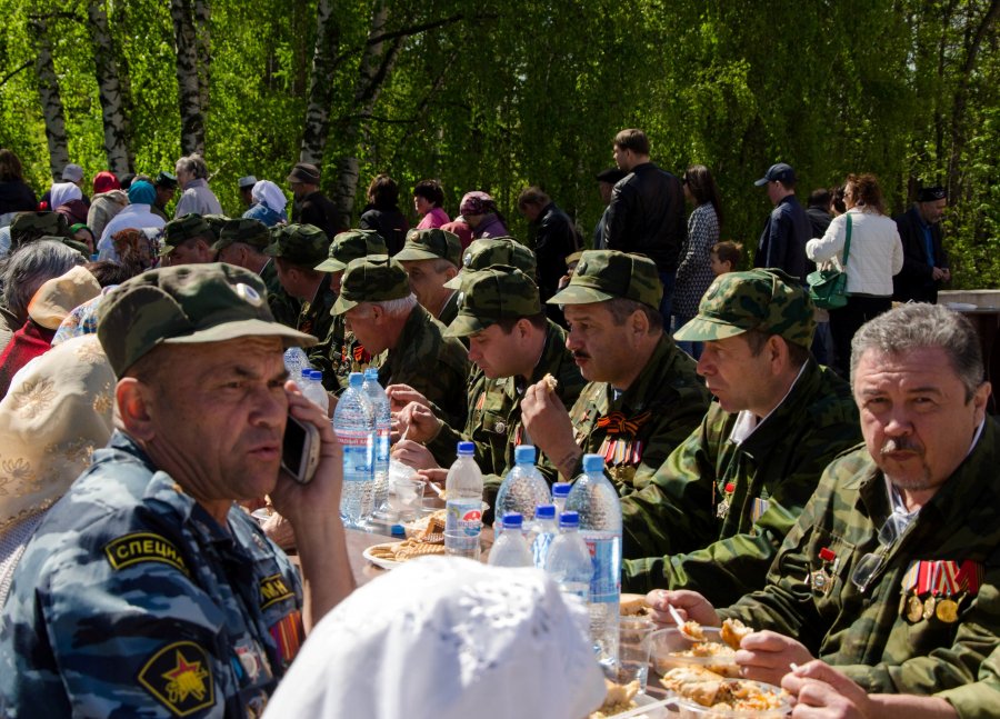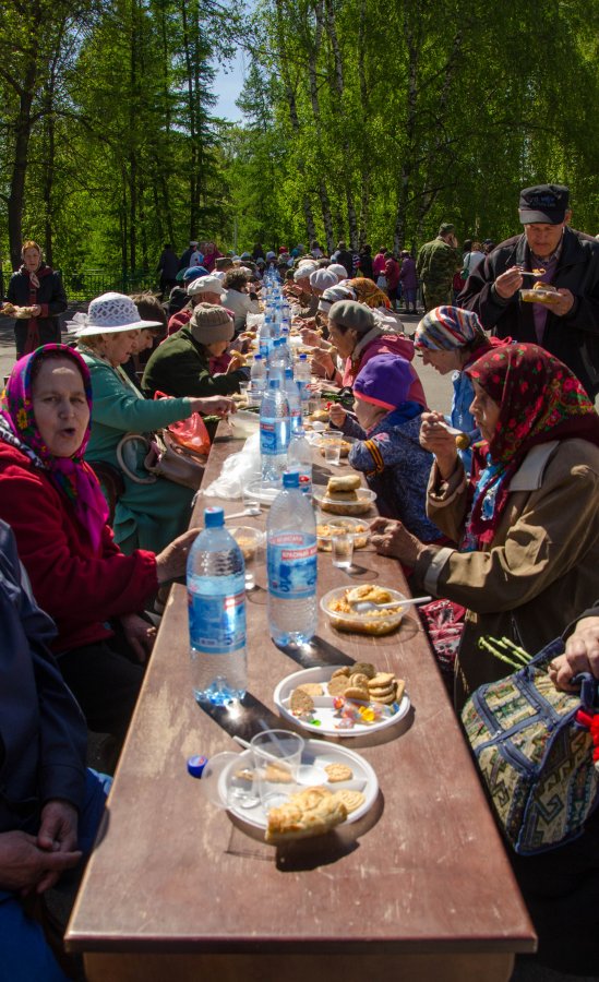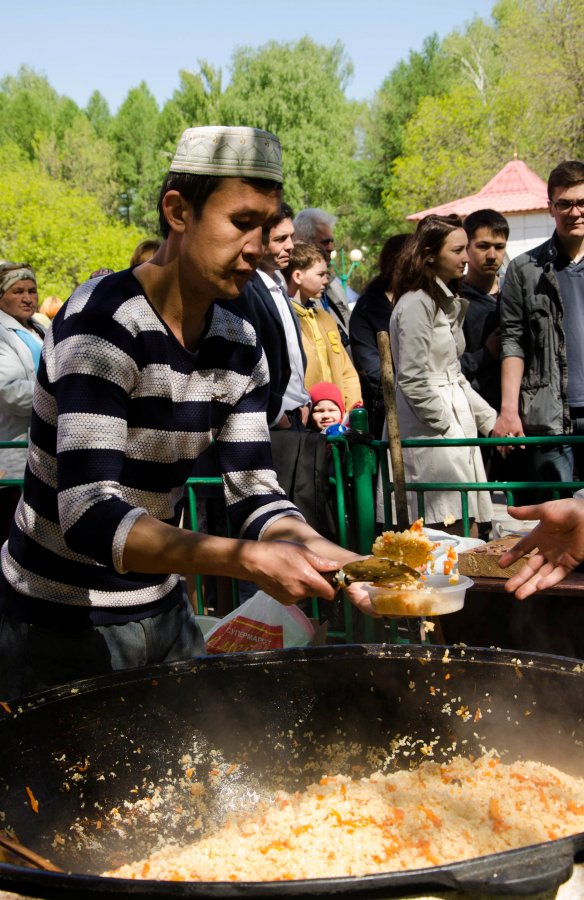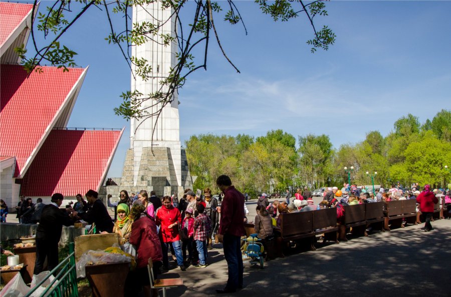 По уфимскому проспекту Октября марширует «Бессмертный полк». Чуть дальше, в парке Победы, ветеранам не дают прохода, одаривая их цветами и открытками. По соседству, в Соборной мечети «Ляля-Тюльпан», не менее многолюдно – здесь для участников Великой Отечественной войны организован благотворительный обед. Наряду с бабушками и дедушками с орденами и медалями на груди за длинным столом сидят ветераны афганской и чеченской войн. Сотрудники храма, представляющие на торжественном мероприятии ЦДУМ России, традиционно угощают всех приготовленным праздничным пловом. Объемный казан, рассчитанный на 600 порций, опустошается мгновенно.