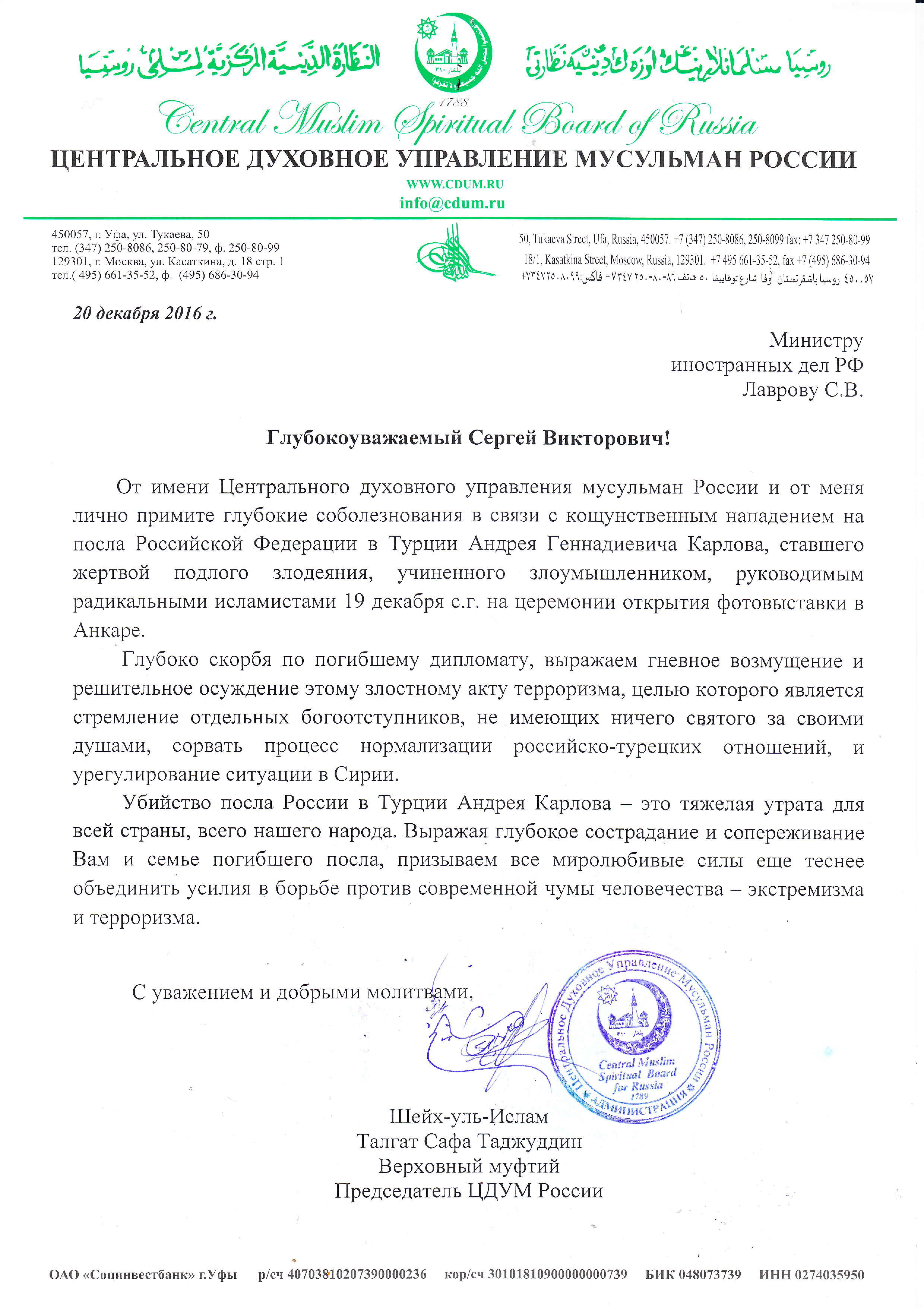 Шейх-уль-Ислам Талгат Таджуддин выразил соболезнования министру иностранных дел РФ С.В.Лаврову в связи с гибелью Чрезвычайного и Полномочного Посла РФ в Турции А.Г.Карлова |