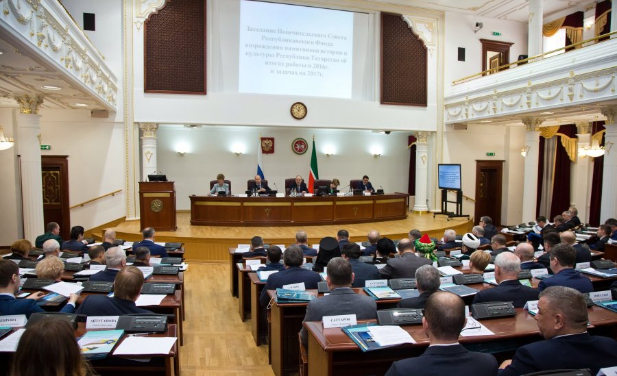 Государственный Советник РТ, Председатель Попечительского совета Республиканского фонда «Возрождение» Минтимер Шаймиев во вступительном слове поблагодарил всех участников заседания за поддержку и сотрудничество: «Наши дела восприняты людьми, все на виду. И мы все больше совершенствуемся. Это программа государственная, с паритетной поддержкой федерального и республиканского бюджетов, и она пока еще продолжается, что тоже отрадно, и, по итогам 2016 года и по планам на 2017 год она позволяет нам в основном выходить на завершающий этап работ в Болгаре и Свияжске». Говоря о строительстве академии, Минтимер Шарипович отметил: «На данный момент нет видимых причин для того, чтобы что-нибудь помешало нашей работе. Комплекс академии будет сдан к 1 сентября этого года. В настоящее время идет отбор и подготовка профессорско-преподавательского состава. Это очень кропотливая и сложная работа. Сегодня в России нет исламского образования, соответствующего нашим традиционным ценностям. Мы выходим на большой путь выстраивания этой системы».
